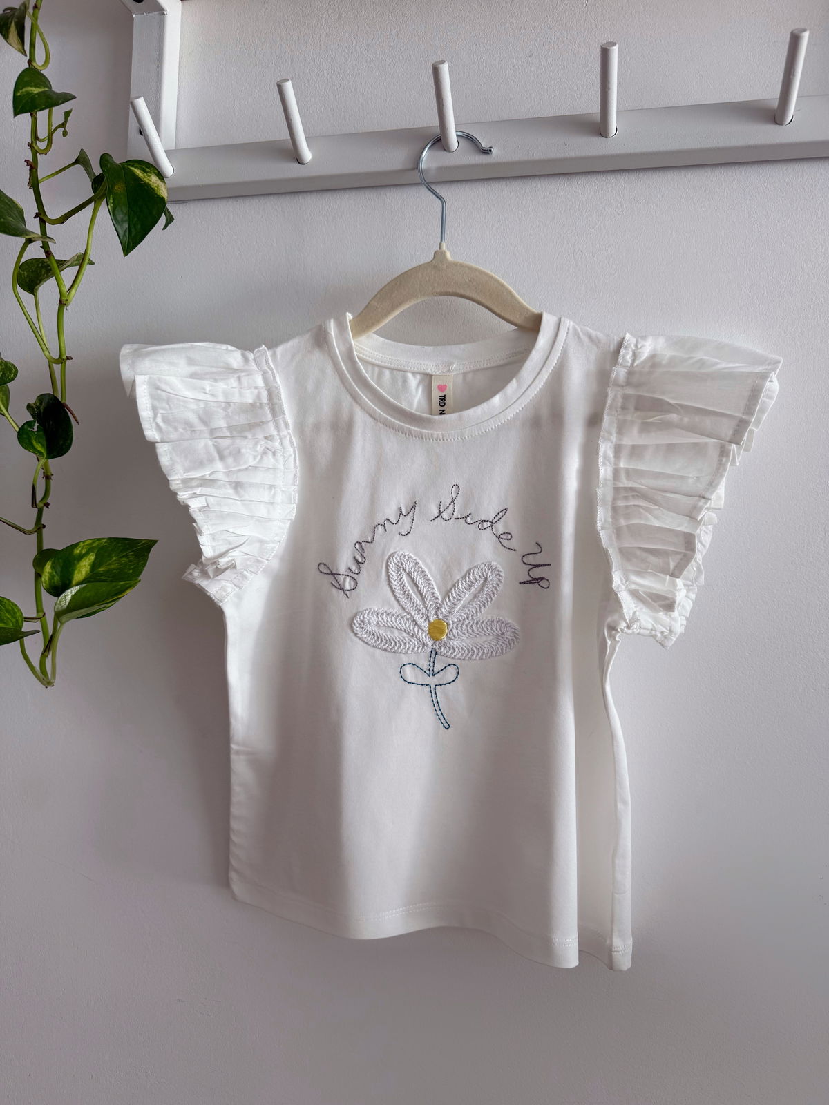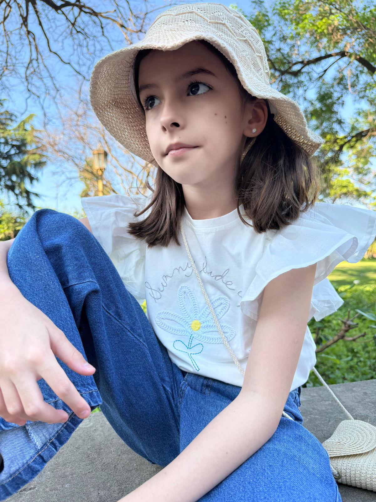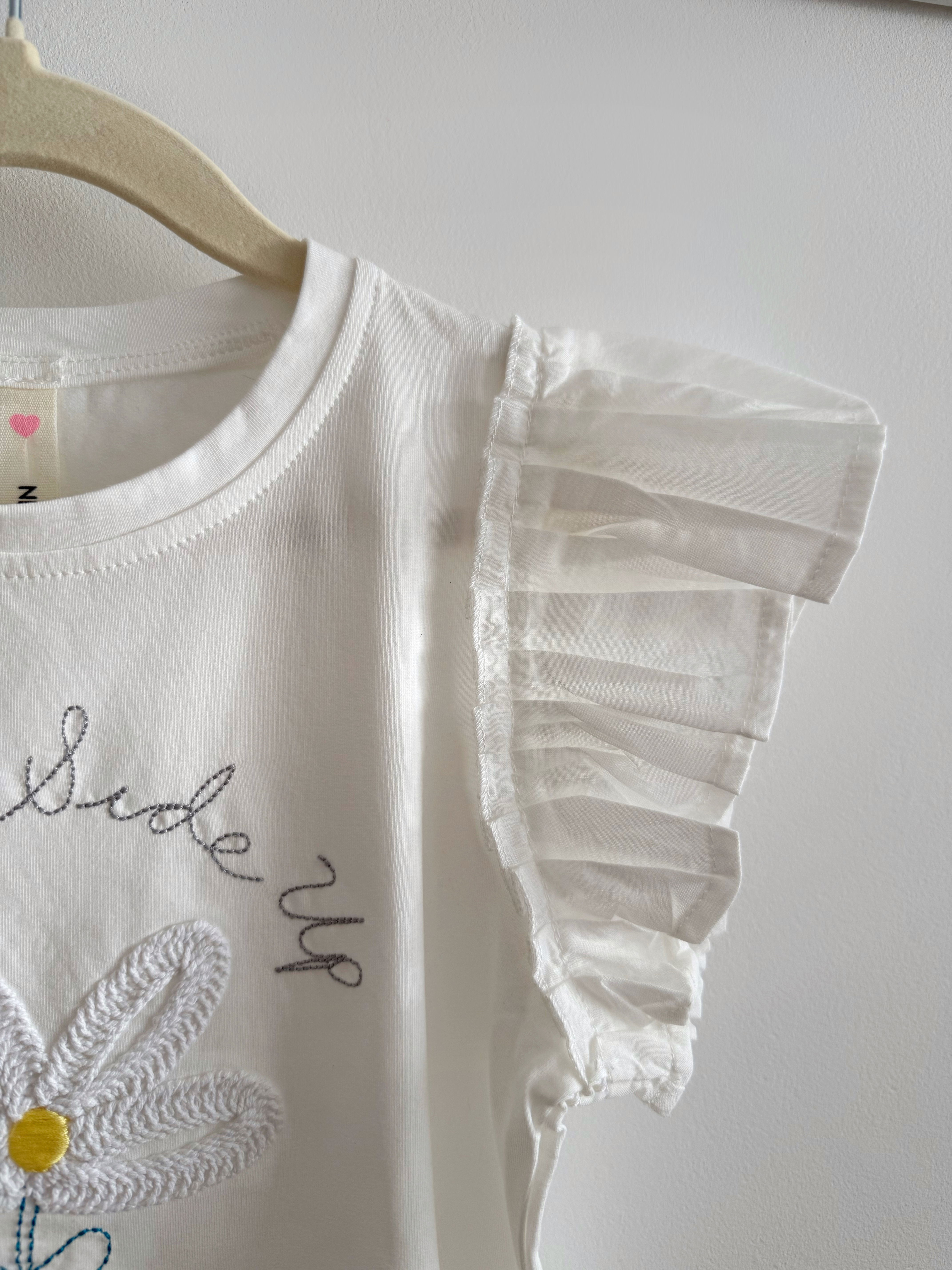 Remera de algodón con lycra, volados de poplin en las mangas y bordado con relieve